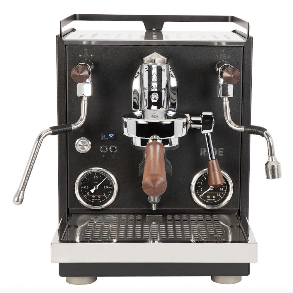 De Ride Exclusive Line, is een espressomachine met een matzwarte behuizing, zwarte manometers en handgemaakte handgrepen van walnotenhout.